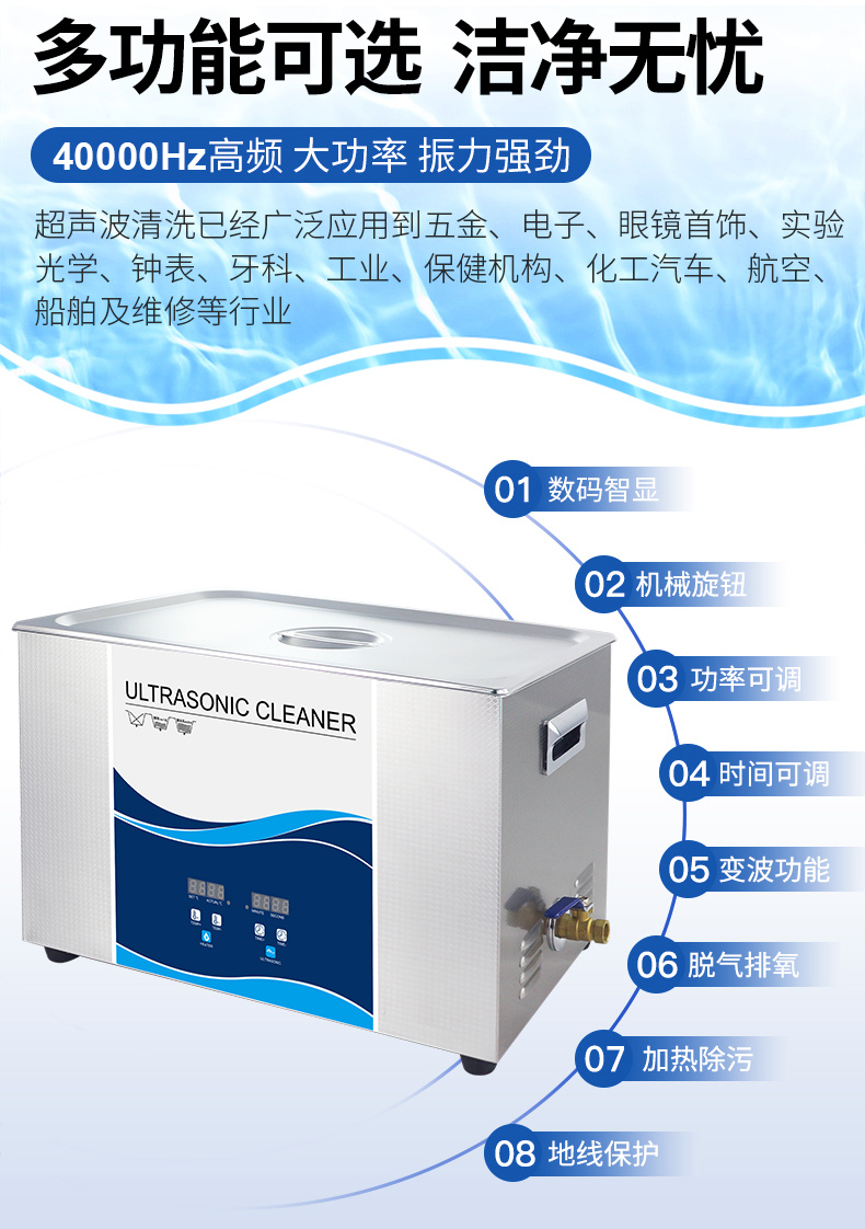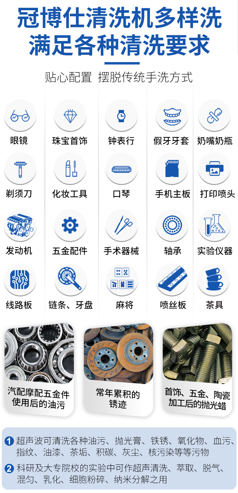 1.家用適用范圍:清潔高檔手表、品牌眼鏡、珠寶首飾等貴重物品和表鏈、水筆、光碟、刮須刀、梳子、牙刷、假牙、 茶具還有奶瓶、 奶嘴具等各類日用品,以及清洗水果、蔬菜、魚肉、碗碟筷等。
