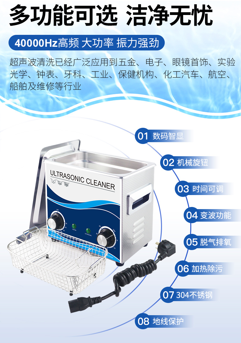 1.家用適用范圍:清潔高檔手表、品牌眼鏡、珠寶首飾等貴重物品和表鏈、水筆、光碟、刮須刀、梳子、牙刷、假牙、 茶具還有奶瓶、 奶嘴具等各類日用品,以及清洗水果、蔬菜、魚肉、碗碟筷等。