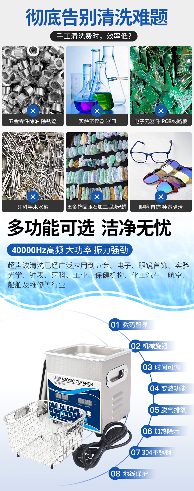 1.家用適用范圍:清潔高檔手表、品牌眼鏡、珠寶首飾等貴重物品和表鏈、水筆、光碟、刮須刀、梳子、牙刷、假牙、 茶具還有奶瓶、 奶嘴具等各類日用品,以及清洗水果、蔬菜、魚(yú)肉、碗碟筷等。