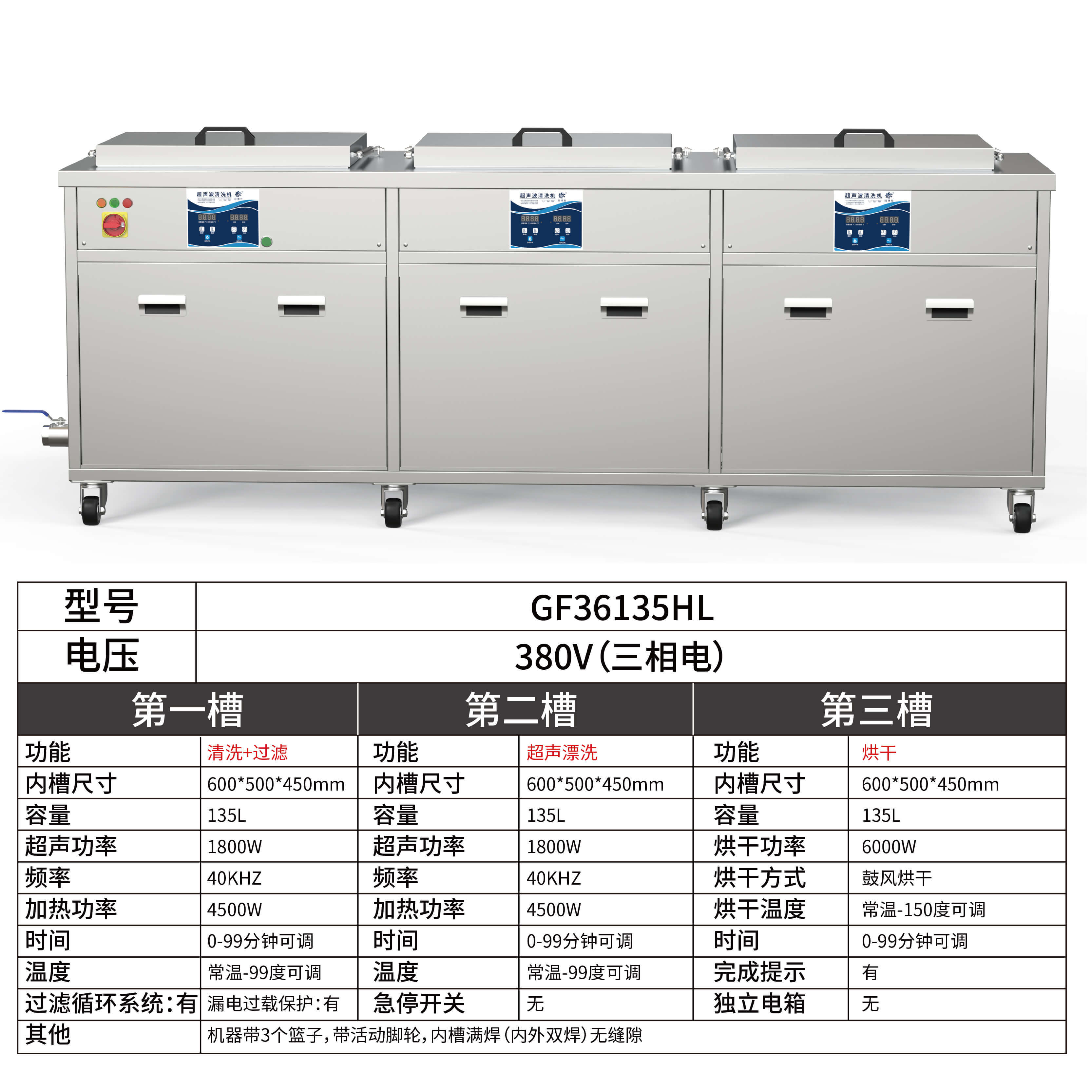 冠博仕GF36135HL三槽超聲波清洗機 | 135L/1800W | 工業(yè)級過濾漂洗烘干設(shè)備 五金模具汽修零件強力除油除銹