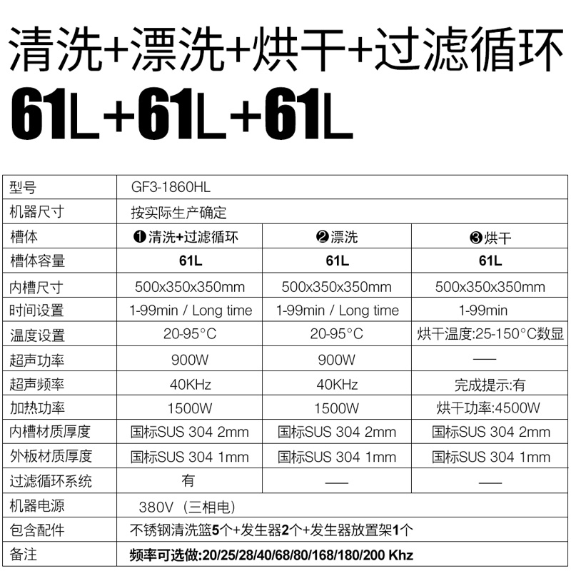 冠博仕GF3-1860HL三槽超聲波清洗機(jī)|61L/900W|45L-960L容量可選支持定制