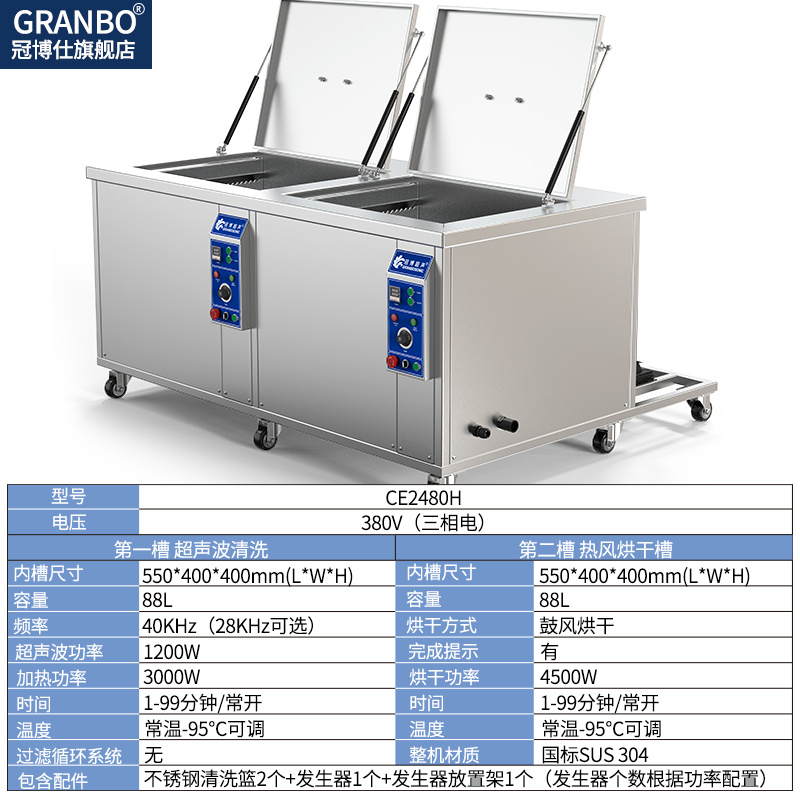 冠博仕GE2480H雙槽超聲波清洗機帶鼓風(fēng)烘干 | 88L/1200W | 適用于五金零部件、汽車部件、航空航天金屬零件清洗