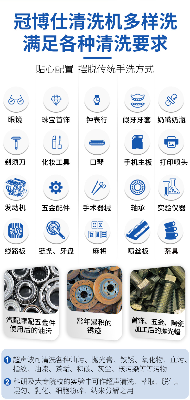 1.家用適用范圍:清潔高檔手表、品牌眼鏡、珠寶首飾等貴重物品和表鏈、水筆、光碟、刮須刀、梳子、牙刷、假牙、 茶具還有奶瓶、 奶嘴具等各類日用品,以及清洗水果、蔬菜、魚肉、碗碟筷等。