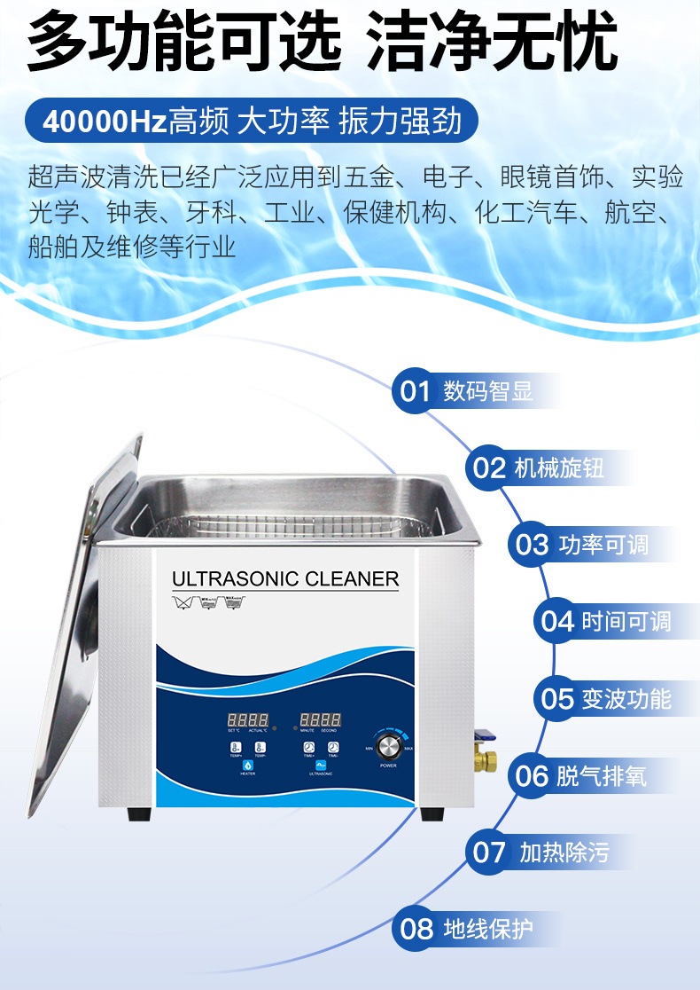 1.家用適用范圍:清潔高檔手表、品牌眼鏡、珠寶首飾等貴重物品和表鏈、水筆、光碟、刮須刀、梳子、牙刷、假牙、 茶具還有奶瓶、 奶嘴具等各類日用品,以及清洗水果、蔬菜、魚肉、碗碟筷等。