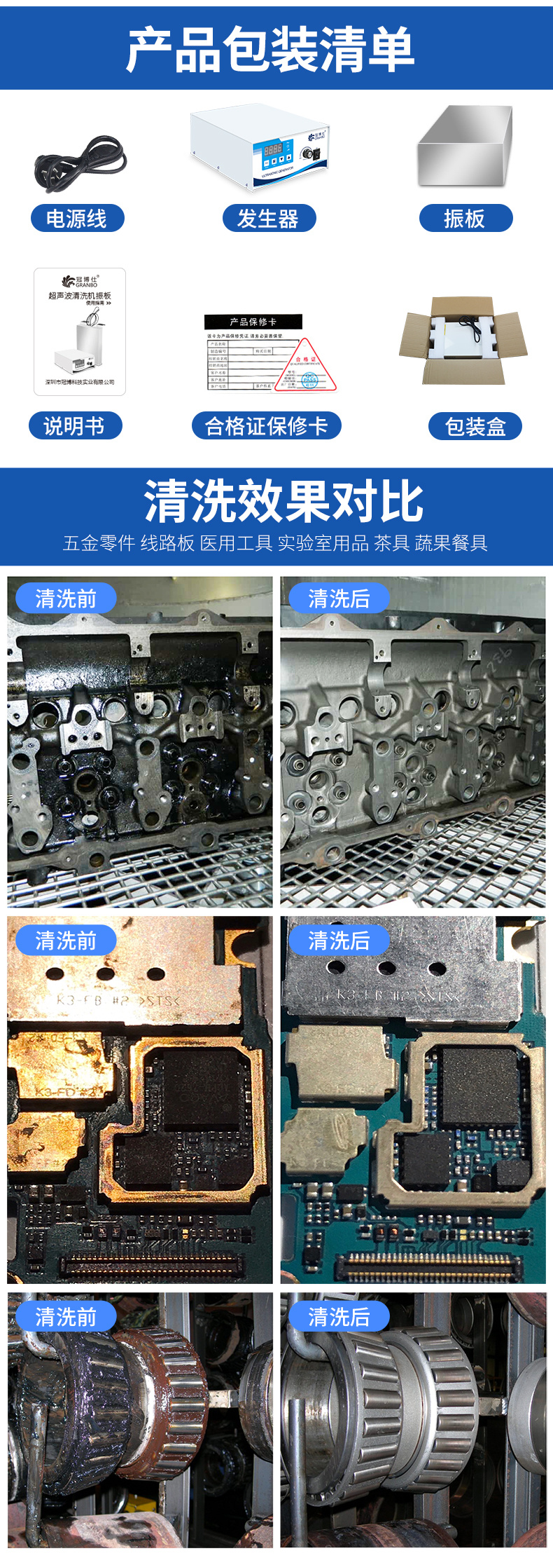 超聲波震板、發(fā)生器、發(fā)生器電源、說明書、合格證保修卡、內(nèi)置珍珠泡沫。